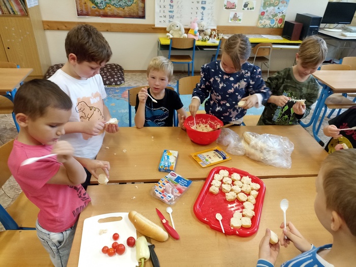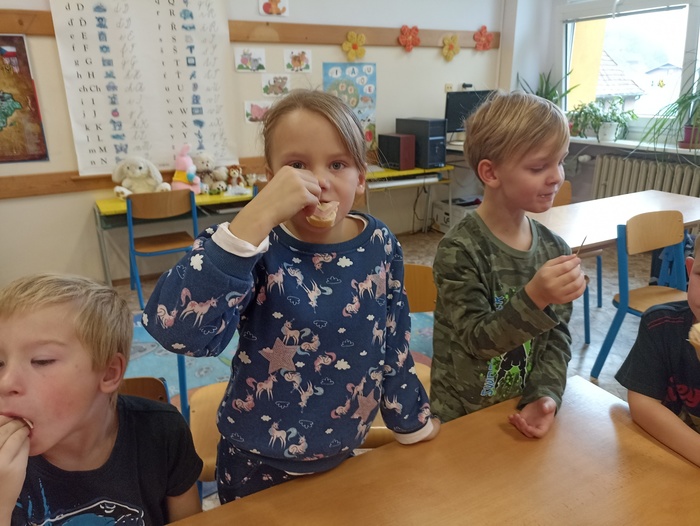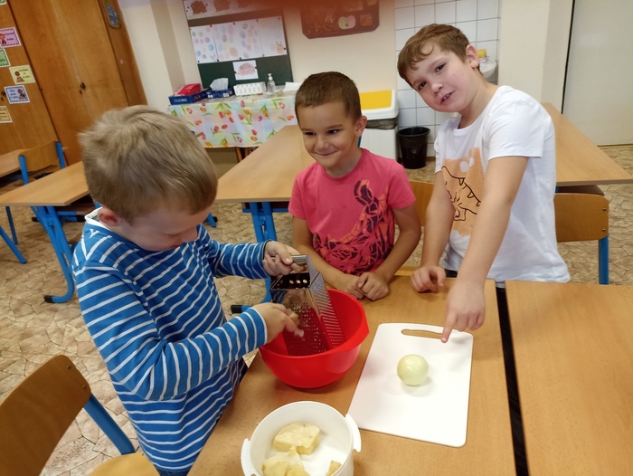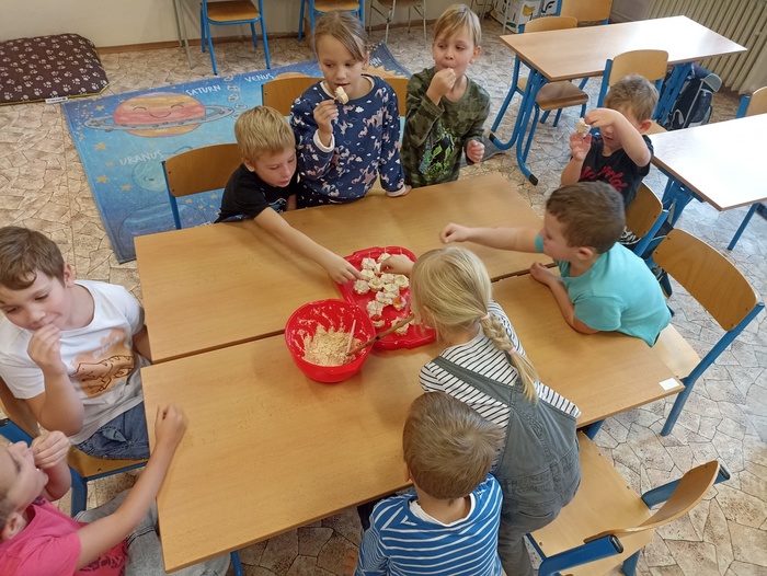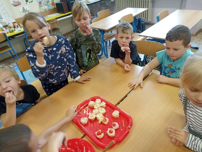 Dne 20.10.23 se konala na prvním stupni soutěž O nejlepší jednohubku. Taky my jsme se zapojili a společně vytvořili celerovou pomazánku. Strouhali jsme, míchali a natírali, nakonec ozdobili a poslali porotě. Zbytek (celý tác) jsme snědli. Moc se nám povedla a všem chutnala.