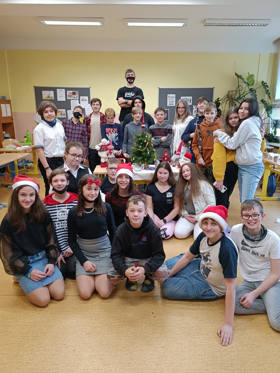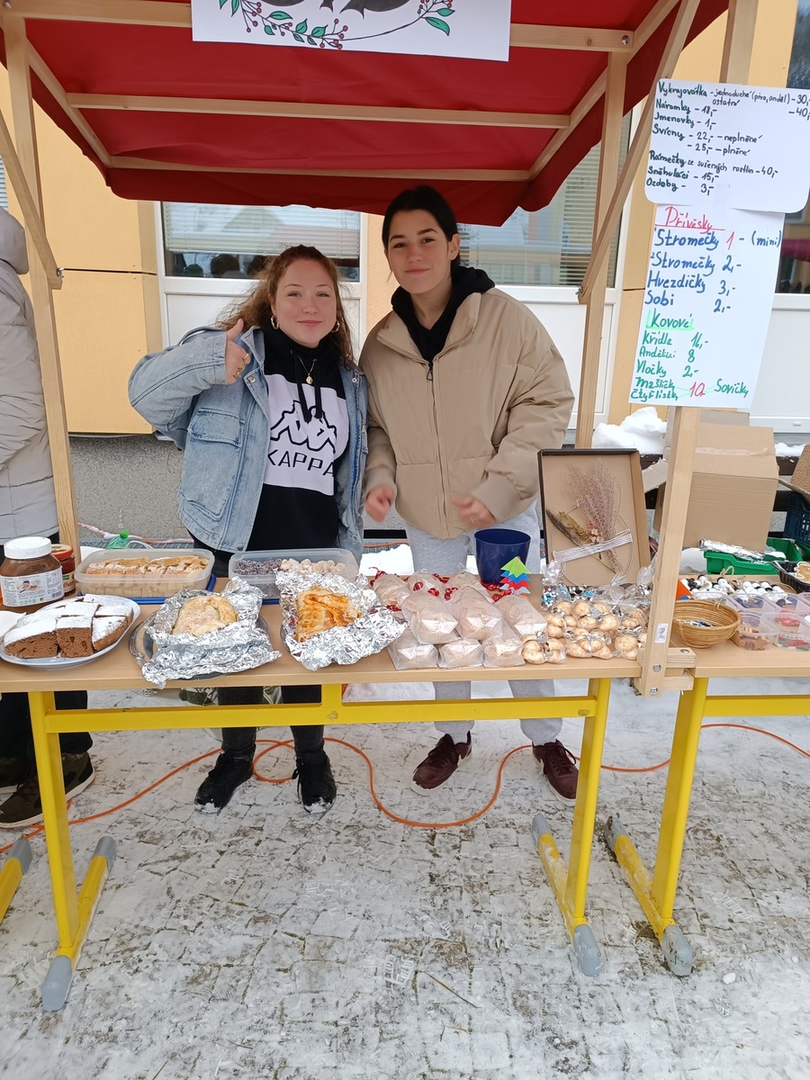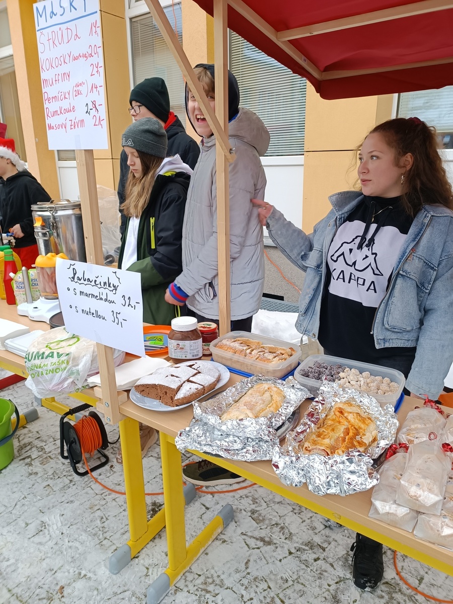Jarmark se vydařil, měli jsme jako třída co nabídnout, i když mráz se podepsal na sortimentu. Ponejvíce šly na odbyt teplé potraviny - u nás konkrétně palačinky a zvlášť žádaný párek v rohlíku. Vykoupili se ale i jiné dobrůtky, které nám pomohli připravit rodiče, hlavně maminky, za což jim velmi děkujeme. Výdělek pro charitativní účely byl pro nás více než uspokojivý.