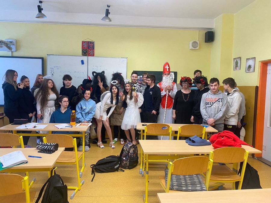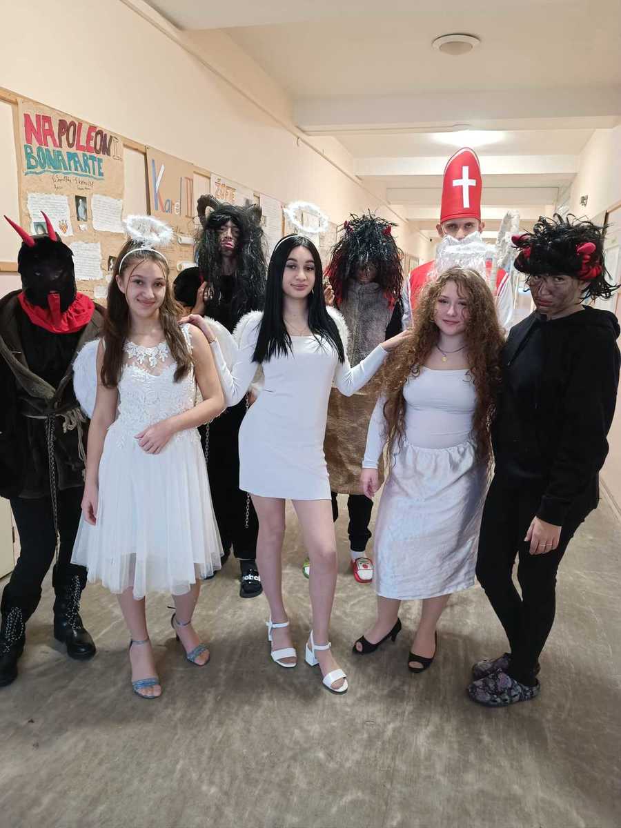 Letos už konečně přišla řada i na naše deváťáky, stali se z nich hroziví čerti, milí andělé a důstojný Mikuláš. Rozdávali jen radost a dobroty, čerti si s sebou do pekla žádný úlovek naštěstí neodnesli.