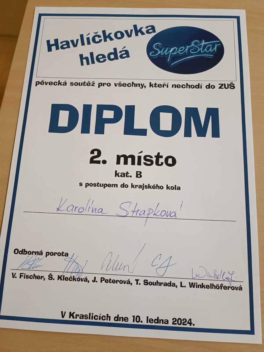 Naše Karolina Strapková se umístila na krásném 2. místě v pěvecké soutěži Havlíčkovka hledá Superstar a postoupila do krajského kola.