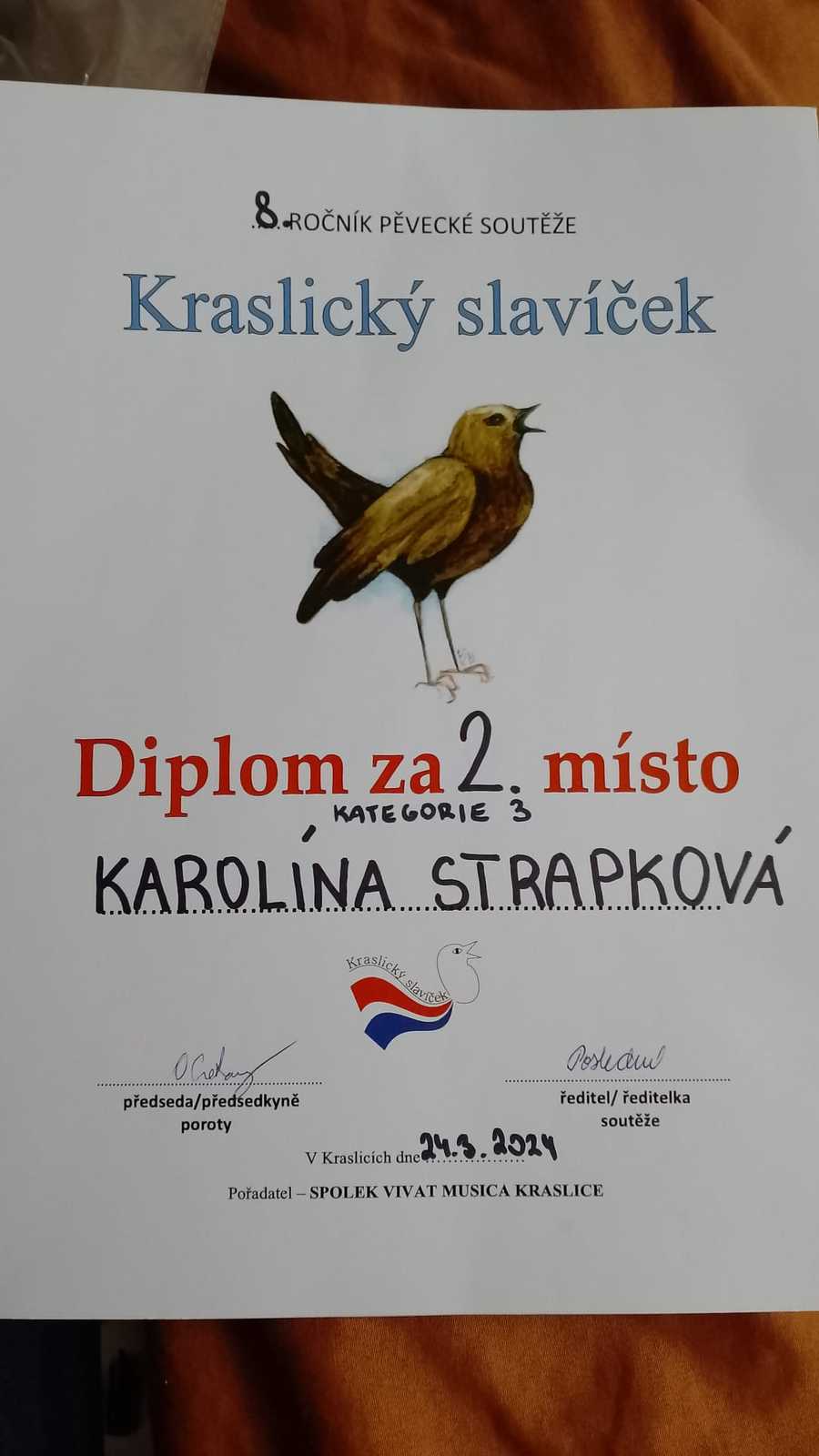 I v soutěži Kraslický slavíček 25. března Karolina uspěla a krásné 2. místo bylo její.