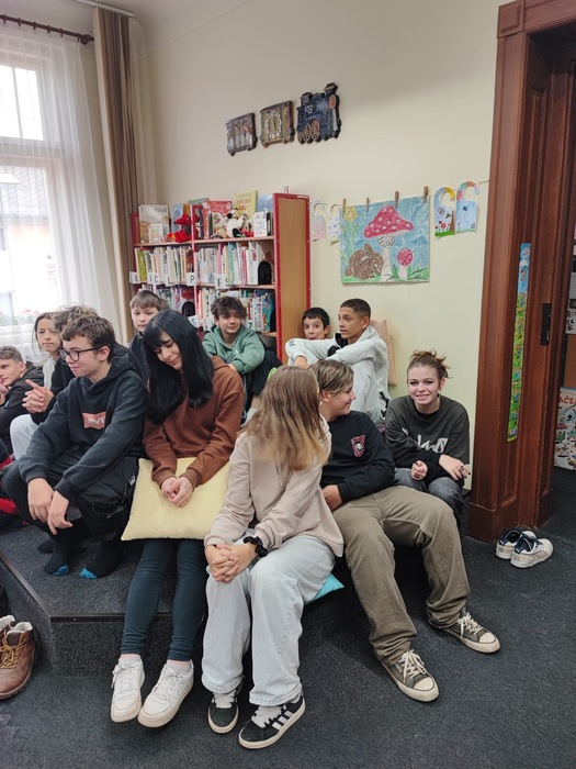 V pátek 8.11.2024 se 8.A vypravila na besedu v Městské knihovně Kraslice. Paní knihovnice pro žáky připravila poutavé povídání o Bibli a biblických příbězích. Děkujeme.