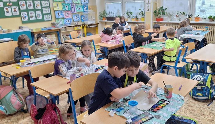 V družině pak druháčci vyrobili sněhuláka, který jim nyní zdobí chodbu.