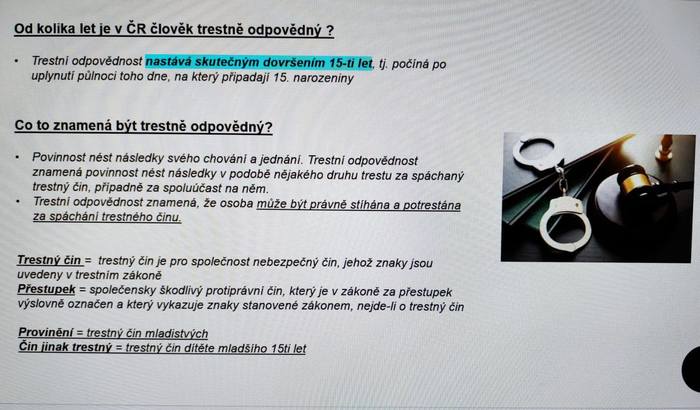 21.1.2025 proběhla v šestých třídách přednáška na téma " Trestní odpovědnost nezletilých a mladistvých ". Žáci si s městskou policií povídali o tom, co znamená být trestně odpovědný a o tom, že za každé protiprávní jednání musíme nést následky. Vysvětlili si rozdíly mezi nezletilým a mladistvým, trestným činem a přestupkem, činy jinak trestnými a proviněním. Dozvěděli se o soudech pro mládež a druzích opatření, které nám soud může uložit. Na závěr se také seznámili s přestupky a nejčastějšími protiprávními jednáními a vysvětlili si, co znamená obecně závazná vyhláška a co konkrétně v našem městě musíme dodržovat.