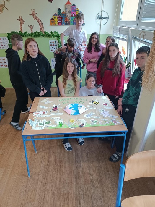 8.A se rozdělila na tři skupiny. První skupina malovala Zemi zemí, druhá se věnovala projektu Biodiverzita a vyčistila a doplnila ptačí krmítka ve školní zahradě. Třetí skupina se věnovala opravě Kneippova chodníku a hmyzích domečků.