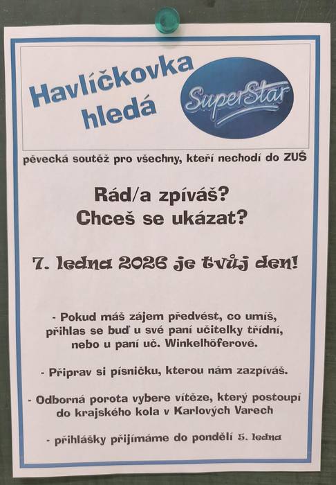 Havlíčkovka hledá Superstar je pěvecká soutěž pro všechny, kteří nechodí do ZUŠ. Uzavírka přihlášek je do 5.ledna 2026 a odborná porota se na zpěváky a zpěvačky bude těšit 7.ledna 2026.