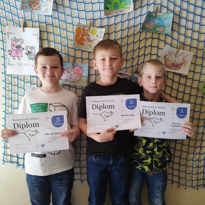 I letos se naši žáci zúčastnili matematicko-logické soutěže Matematický klokan. Soutěžili ve čtyřech věkových kategoriích. Za nejmenší Cvrčky (2.-3. třídy) obhájili nejlepší místa František z 2.A s 63 body, Jan z 2.A s 53 body a Martin z 2.B s Lucou ze 3.A se shodnými 52 body. V kategorii Klokánek (4.-5. třídy) první místa obsadili žáci 5.A Kájík s 104 body, Teodor s 103 body a Daniel s 75 body. V kategorii Benjamin (6.-7. třídy) se nejlépe umístili Anna Marie z 6.A s 65 body, Max z 6.B s 59 body a Leon ze 7.A s 57 body. Nejstarší žáci (8.-9. třídy) byli v kategorii Kadet a nejlépe si vedli žáci 9.A, a to Vítek s 85 body, Laura s 82 body a se stejným počtem 73 bodů Týna a Martin. Všem zúčastněným a vítězům děkujeme za skvělé výkon.