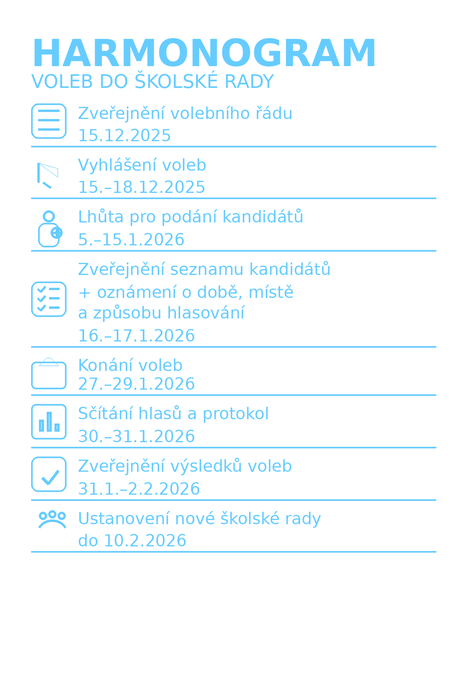 jsme před dalším důležitým krokem, kterým je obnovení činnosti Školské rady a volby jejích členů. K časovému harmonogramu průběhu voleb přikládáme i potřebné dokumenty. Jelikož funkční školská rada může být přínosným partnerem pro fungování a rozvoj školy, věříme, že se do voleb aktivně zapojíte a pomůžete nám najít takové zástupce z vašich řad, kterým záleží na kvalitě školy, stejně jako nám.